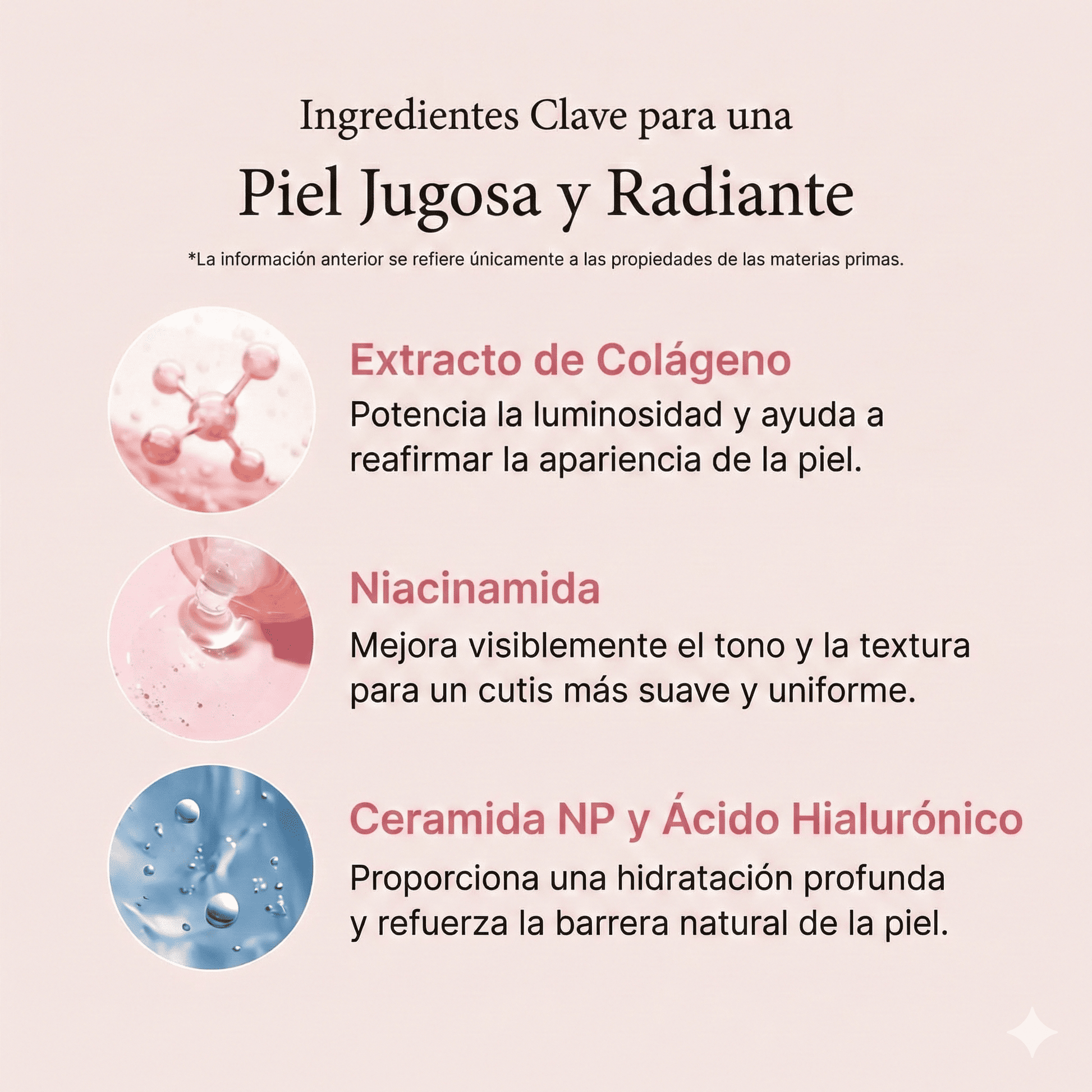 Agua, Alcohol polivinílico, Glicerina, Extracto de tallo de Agave americana, Hialuronato de sodio, 1,2-hexanodiol, Caprilil glicol, Laurato de poliglicerilo-10, Extracto de Chlorella vulgaris, Glucosa, Butilenglicol, Etilhexilglicerina, Fructooligosacáridos, Fructosa, Goma xantana, Extracto de Cynanchum atratum, Triglicéridos caprílico/cáprico, Lecitina hidrogenada, Extracto de flor de Althaea rosea, Ceramida NP, Tocoferol (vitamina E), Extracto de Pancratium maritimum, Extracto de colágeno, Glutamato estearoil sódico.
